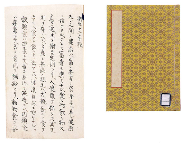 衛生十二字歌 [えいせいじゅうにじか] 一冊 松ヶ岡文庫蔵 紙本墨書 袋綴 縦20,5×横14,2 明治7年(1874)以前 鈴木大拙の父良準(1822〜76)が子どもたちのために著した衛生論。子どもたちが調子よく唱えられるように、一区切りが十二音(仮名書きすると十二字)となっていることから十二字歌と命名したものである。「穀物食ハ燃素トテ 吾ガ身体ヲ温暖ニシ」と始まる。内容は緒方洪庵(1810〜63)の次男である緒方洪惟(1843〜1909)が書いた『衛生新論』をもとに書かれたものである。鈴木家では、毎朝子どもたちがこれを暗唱していたといわれている。大拙によって『修身十二字歌』と一緒に綴じられ、桐箱に収められ松ヶ岡文庫に保管されている。 ※画像をクリックすると大きい画像をみることができます。 |